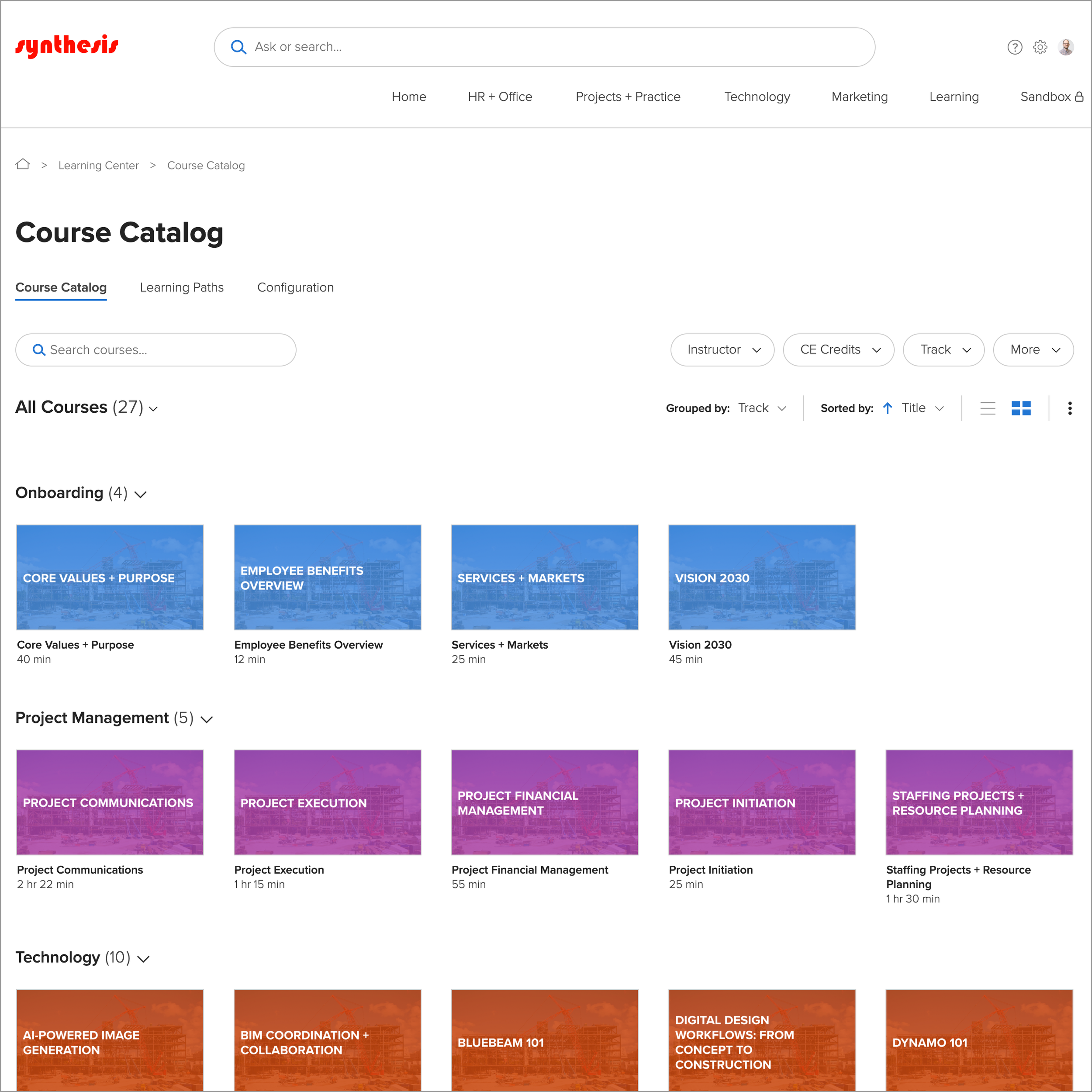 Currently in private beta, Synthesis LMS, our learning management system for AEC firms, brings training, firm knowledge, and AI Search together in one integrated platform—making it easier for employees to learn, grow, and succeed.